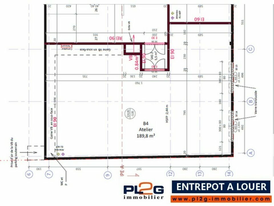 Le local a une superficie de 190m² et bénéficie d'une hauteur sous plafond à 2,44m.